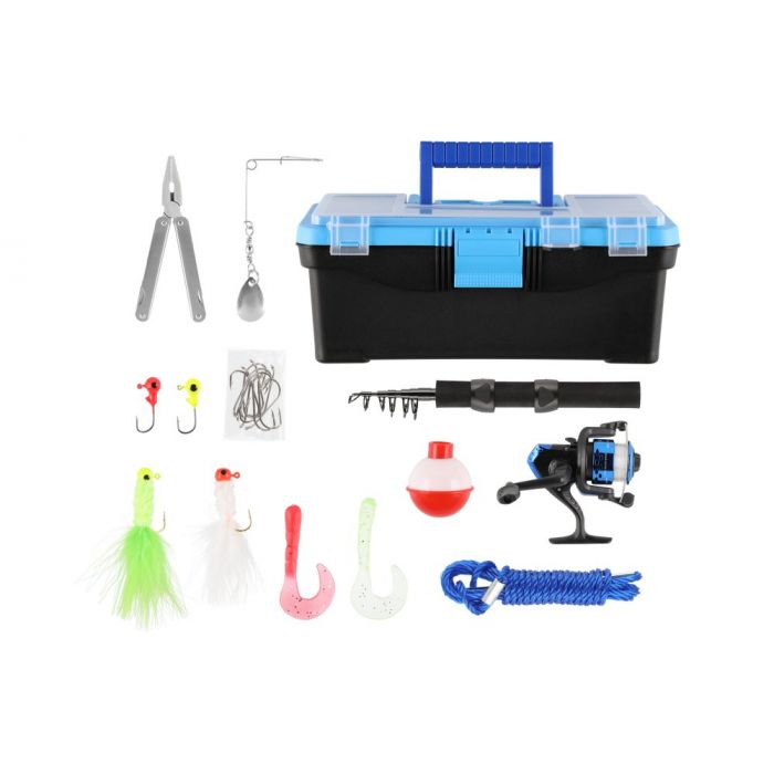 Komplektis: 1,35 m avatud rullikomplekt õngenööri, kalastustarvikud (4 jigikonksu, 3 tasakaalukonksu, 3 lendkonksu, 10 konksu, 10 jigi, 2 ujukit, 1 õngenöör), tangid.